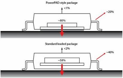 裸焊盘型封装通过封装底部传导约80%的热量到PCB,剩下20%的热量从器件引脚和封装侧边散发掉。从封装顶部散发的热量不到1%。