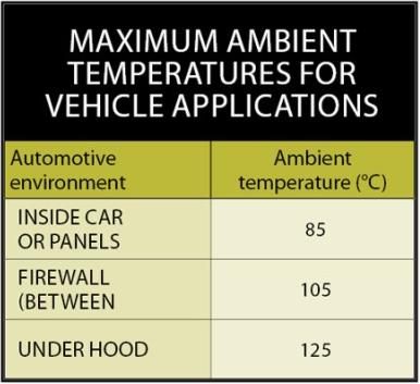 汽车环境和其它环境下的温度绝然不同。一般来说,消费电子产品的工作温度在25℃左右,上限约为70℃。另一方面,汽车乘用车厢或仪表盘应用中的电子器件将运行在高达85°C的高温环境下(参考附表)。