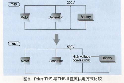 在THS中,蓄电池通过逆变器直接与电机和发电机相连(见图8);而THSⅡ中,蓄电池组输出的电压首先通过DC-DC升压变换器进行升压操作,然后再与逆变器相连,因此逆变器的直流母线电压从原THS的220V提升为现在的500V。