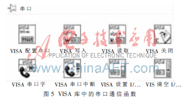 LabVIEW是使用图形化编程语言,功能强大而又灵活的仪器应用和分析软件系统,主要用于仪器控制、数据采集、数据分析等领域,适应多种操作系统。LabVIEW中提供各种总线的驱动程序,可以用来编写各种总线形式的仪器驱动程序。VISA库即I/O接口软件库及其规范的总称,是LabVIEW的仪器驱动库之一。VISA是在LabVIEW开发平台上控制VXI、GPIB、RS232、PXI、PCI以及其他种类仪器的单接口程序库,是对其他总线驱动函数进行的一个统一封装的高层API[5],本身不具备编程能力,可以根据使用的仪器类型,调用适当的底层驱动程序来控制仪器。串行通信使用的VISA库中的API函数如图5所示,路径为:Functions>>Instrument I/O>>VISA Advanced>>Interface Specific>>Serial。