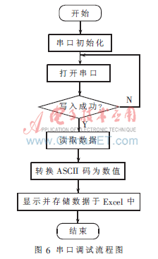 串口调试设计主要包括串口初始化、读写数据、数据显示并保存等部分,程序设计流程图如图6示。