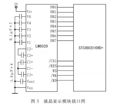 显示模块采用带中文字库的LM6029LCD显示屏显示输出。LM6029点阵图形液晶显示模块采用S680724控制器,点阵数128x64,自带中文字库,采用8bit的并行接口与主控CPU相连,显示模块与主控CPU的接口电路如图3所示。