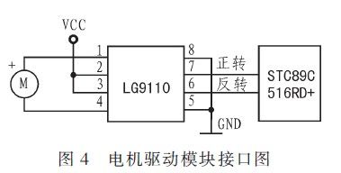 直流电机的驱动采用LG9110驱动芯片,它能通过控制线带动直流电机的正、反转,从而控制外部输出设备的动作,电机驱动模块与主控CPU的接口电路如图4所示。
