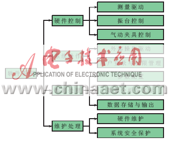 软件在功能实现上采用模块化的方式,特定的模块实现特定的功能。主要组成模块有测量驱动模块,振台控制模块,气动夹具控制模块,外部操作驱动模块,硬件维护模块,系统安全保护模块,用户登录与权限管理模块,参数配置模块,数据分析与显示模块,数据存储与输出模块等,如图4所示。