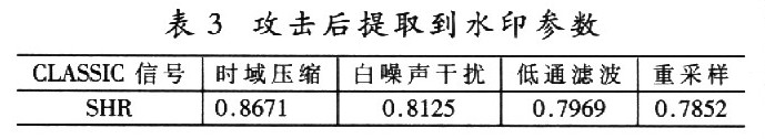 为了验证算法的鲁棒性,需对该嵌入水印的音频信号进行攻击处理。这些攻击包括:低通滤波、时域压缩、添加噪声等。对受攻击后检测出的水印性能的评测.也是利用识别率来衡量的。实验结果表明(如表3),该算法对时域压缩有明显的抵抗力,对其他攻击也有较好的鲁棒性。