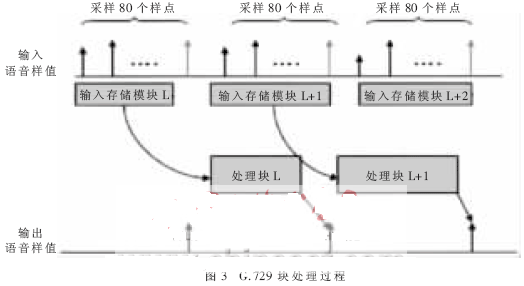 G.729的处理过程中采用块处理技术如图3所示。按照G.729标准,每块(帧)由80个样本组成,最初80个样本被存起来,处理过程中有两个操作是同时进行的。在处理块L中数据的同时,存储L+1块的数据。