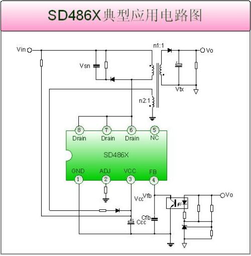 SD486X系列芯片是由杭州士兰微电子推出的应用于开关电源的内置高压MOSFET、电流模式PWM+PFM控制器。该系列芯片具有低功耗、低启动电流和较低的EMI,最高效率可以达到84%以上,启动电压、输出电压和最大功率均可调节。目前芯片可以提供的功率范围为:宽电压范围5~18W,窄电压范围7~21W。可广泛应用于机顶盒、DVD播放机、电源适配器等整机产品中。