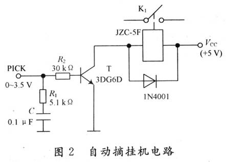 自动摘挂机电路如图2所示。由三极管反相放大电路和继电器组成。系统检测信号电平为0~3.5 V,当系统检测到报警信号时,主控系统使PICK变为高电平,三极管导通,继电器吸合,K1接通,系统自动摘机。当用户执行完命令操作之后(如向外报警过程完成后),主控系统给PICK一个低电平,三极管截止,继电器释放,开关K1断开,自动挂机。