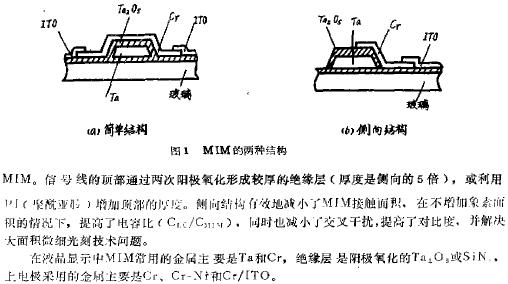 MIM是由金属、绝缘体、金属三层薄膜组成的夹心结构。用于液晶显示的MIM结构如图1所示,主要有两种: (1)图1(a)是比较常见的"T"形结构。这种结构的工艺过