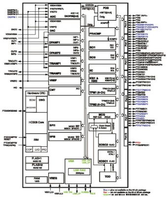 -多功能时钟发生器(MCG)- PLL和FLL精密微调的内部参考,允许温度和电压2%的偏差和0.2%的分辨率,支持从4 kHz~48 MHz的CPU频率。