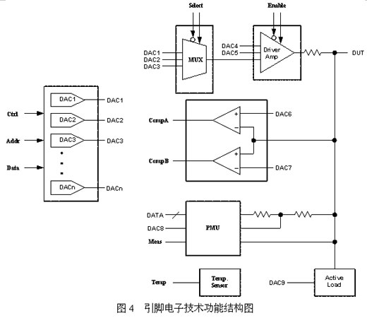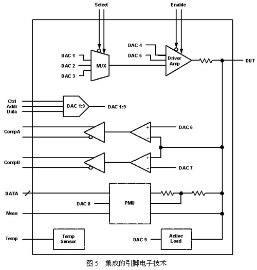 尽管某些功能已经集成到了一起,而且目前也已经提供,但大多数解决方案都要求两到三颗芯片才能完全实现测试头 (test head)。为了降低成本、提高功能引脚功能,并增加相同测试头数量下的引脚数量,我们应当进行功能集成,外部组件必须最小化,而且还应充分挖掘有关架构方面的改进。图 5 显示了我们所建议的一种引脚电子技术器件,其在同一芯片上集成了上述所有功能。