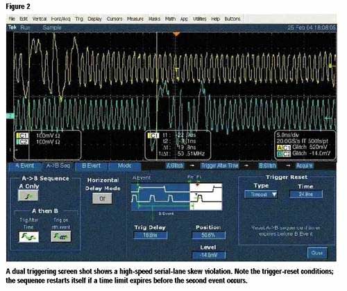 图2: 双触发快照,显示了高速串行通路偏移超限。注意触发复位条件,如果在发生第二个事件前时限期满,序列本身会再次启动。