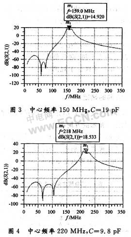 通常,电调谐滤波采用双极点调谐滤波,谐振回路分为串联谐振回路和并联谐振回路,通过电感或电容进行耦合。此电调滤波器采用的是并联谐振回路,用电感进行耦合。在进行仿真之前,需要建立仿真模型和设计各种参数。基于以上模型,利用ADS软件对电调滤波器进行电路设计和仿真。由于系统要求对该电调滤波器进行AGC控制,所以在仿真时加入双栅FET。传输函数S21、频率范围设在10~350 MHz、电容在2.6~39 pF之间变化,仿真使用的放大器是NE25118。最终的ADS模型仿真结果如下面两组曲线所示。若LC滤波器不使用放大器,仿真结果中可以看出滤波器的插损在2~3 dB左右。