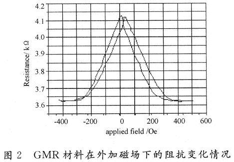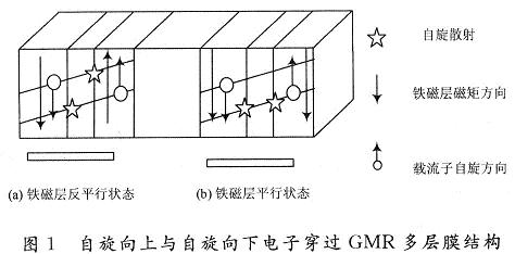 1988年派瑞松大学的研究人员发现了GMR效应,这是一种在铁磁性层与非铁磁性层交替叠置的结构中观测到的量子效应,是指某些磁性或合金材料的磁电阻在一定磁场作用下急剧减小,而Aρ/ρ急剧增大的特性,一般增大的幅度比通常的磁性与合金材料的磁电阻约高10倍。GMR效应的理论很复杂,许多机理至今还不清楚,目前普遍接受的解释是两流模型,如图1所示。多个铁磁层中的磁矩方向由施加的外磁场控制,当铁磁性层的磁矩反平行排列时见图1(a),载流子受到的自旋散射最大,多层膜电阻最高;当铁磁性层的磁矩平行排列时见图1(b),载流子受到的自旋散射最小,多层膜的电阻最低。