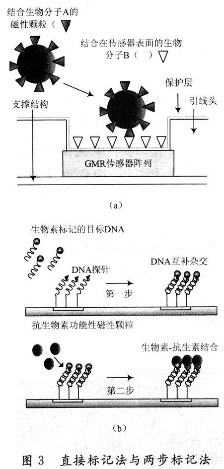 两步标记法 如图3(b)所示,以DNA检测为例,第一步将已知序列的DNA探针链结合在包埋了自旋阀传感器的芯片表面,加入用生物素标记的DNA目标链溶液,进行充分杂交;第二步,加入被抗生物素包裹的磁性颗粒,形成生物素一抗生物素共价键,从而选择性地捕获磁性标记。