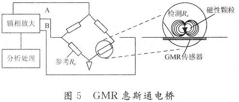 通常,整个GMR生物检测系统由微流部分、GMR阵列、驱动部分、分析处理部分组成。为了减少外界环境对传感器输出稳定性的影响,传感器单元往往与参考单元一起组成惠斯通电桥。如图5所示,GMR电阻对组成惠斯通半桥,其中一个电阻表面覆盖软磁性屏蔽层,不受外加磁场的影响;另一个电阻作为应变电阻,在GMR效应作用下,阻值随外加磁场变化,导致电桥输出微伏级的差分电压值,输出的电压经过过滤、放大等处理后,再输送到后端的采集检测设备,做进一步分析。