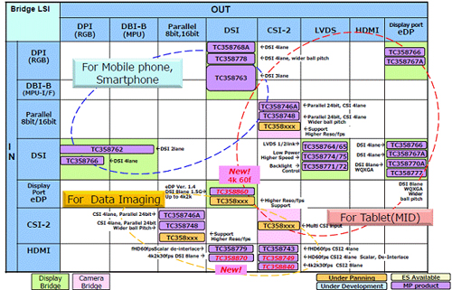 东芝的网桥和缓存器IC支持各种串行数据传输协议,例如MIPI®,MDDI,LVDS,Display Port和HDMI,便于设计手机。