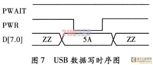 本系统使用一个状态机实现该功能,状态机在"查找"和"传输"两个状态之间切换。系统启动以后首先进入查询FIFO的状态,在查询到FIFO中的数据量大于一个USB数据包(2 040 bit)时,状态机进入到"传输"状态。在"传输"状态下,按照上述同步。DMA写时序,首先传输6 bit包头,然后传输2 040 bit数据,最后传输2 bit数据校验。在数据传输的过程中,电路要一直查询DMAING的状态,检测到:DMAING为低时要暂停数据传输。在传输完2 kB数据后,状态机再转入到"查询"状态,进行下一轮数据传输状态。
