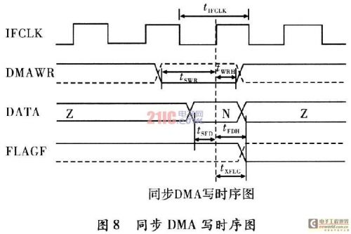 模块2实现在DMA模式下FPGA向主机的批量数据传输。同步DMA的时序图如图8所示(时钟由FPGA提供)。