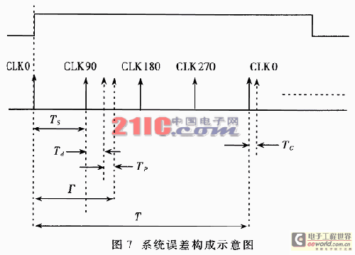 由前所述,当80MHz晶振时钟输入时,系统原理误差TS=3.125ns.时钟相移误差为从CLKDLL中出来的四路时钟信号之间本身的相位偏移,根据芯片提供的参数,其最大TP为200ps.计数时钟抖晃是指从CLKDLL中输出的时钟信号本身周期的偏差,其最大TC为60ps.由于计数的时钟周期数较多,故平均后其对整个系统的测量误差影响可以忽略不计.