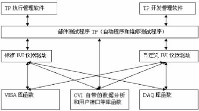 CVI在标准C语言(Ansi C)的基础上增加了仪器控制和工具函数库的虚拟仪器开发软件,提供了很多实用的例程,具有友好的图形用户界面,并且C语言是大家都比较熟悉和易于使用的开发工具,因此选用CVI可以加快测试程序(TP)的开发。系统软件原理见图2。