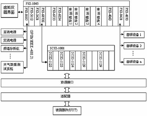 由于PXI模块较多,且为了今后的扩展,选用了18槽的PXI-1045机箱;为了进一步提高系统平台的集成度,选用PXI-8187零槽嵌入式控制器,摒弃了以往系统中利用MXI-2将工控机作为主控器的方式。PXI-8187带有GPIB接口,可以方便的扩展GPIB总线设备。部分仪器资源和部件需要串口通信,故选用PXI-8421扩展4个串口。