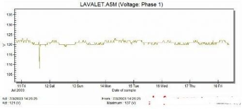 上图所示:某电压在连续7天内的变化,在第1天出现了1次电压短暂跌落。您可能会问,如果电压随时都在变化,为何用电设备没有随即出现故障?其原因是,电子设备的电压适应范围是正常电压的±10%。而且,设备类型不同其承受电压变化的持续时间也不同。电压的首次变化不一定使设备损坏,但如果电压波动持续时间过长或电压事件频繁出现,超出了设备的耐受能力,设备就会损坏。