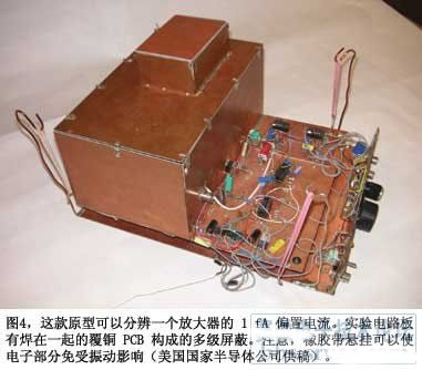 图7表明,Grohe并未将DUT插入插座内,所有管脚均未与PCB接触。为尽量减小泄漏,Grohe只将两只电源脚作为长而独立的插座,而且并未安装在PCB上。同样,他将待测管脚连接到一个插座和一个2英寸悬置线上,并将管脚/插座组合连接到积分放大器的输入端。为防止DUT运行在开环状态,Grohe将两个插座焊在一起,将空中悬浮的输出脚桥接起来。空气的流动会带来充电的离子,造成虚假读数,因此Grohe将整个 DUT 封装在一个屏蔽的覆铜盒内。