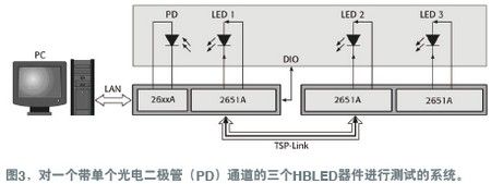 元器件操控器将单个HBLED(或者一组HBLED)运送到一个测试夹具上,夹具可以屏蔽环境光,且内带一个用于光测量的光电探测器(PD)。需要使用两个SMU:SMU#1向HBLED提供测试信号,并测量其电响应;SMU#2则在光学测量过程中检测光电探测器(图2)。