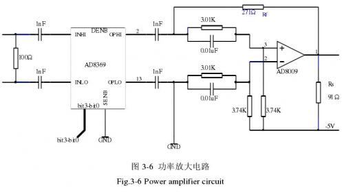 如图3-2所示,在可控增益放大器AD8369 [24]的后面加有固定宽带运放AD8009和射频功放RF2317,这主要是为了进一步增加信号的功率,使其达到更高的功率范围,其中AD8009还有把差分信号转换为单端信号的作用。