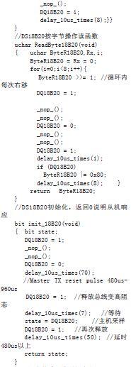 D S 1 8 B 2 0对时序要求非常严格,编程时应确保延时程序要符合datasheet中的要求,这里首先编制了一个较精确的10us延时,之后的程序中多次调用。另外,摄氏、华氏温度的转换,以及低于0摄氏度时,需要显示的负号等情况都可在液晶显示温度的程序段中考虑。典型程序如下: