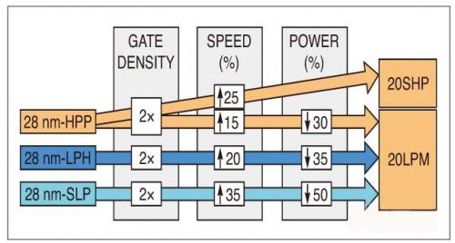 图1,台积电的28-HPL工艺待机功耗较40-LP工艺低40%以上。而Global Foundries则为其28nm结点提供了三种功率水平