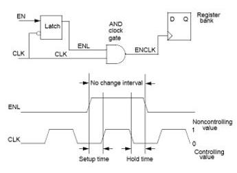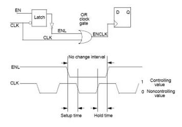 latch-free的方案中,EN信号必须在时钟负沿前稳定,否则时钟会出现毛刺,造成只留给EN产生逻辑半个时钟周期的时间。latch-based方案则不存在这个限制,但引入latch使时序分析,测试复杂性增加。故选择哪种方案需要设计者权衡决定。