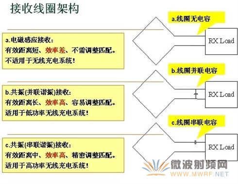 c. 发射/接收的线圈与电容谐振组合:此部份为过去从未出现过的技术,由于无规则可循所以只能透过不断的尝试,另外未了阻绝多于的能量散到其它地方,于线圈的未感应侧都会家上磁性材料,这类的材料特性也是全新的应用。