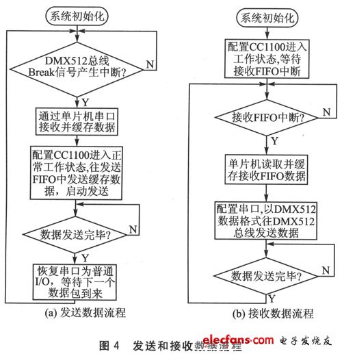 接收模块的工作流程和发送模块相反。在初始化完成之后,单片机设置好CC1100的FIFO寄存器,等待FIFO产生外部中断。这里外部中断被用作无线数据接收成功的标志。FIFO中断产生后,单片机通过SPI总线缓存FIFO中的数据,并立刻通过串口模拟DMX512时序,恢复总线信号,完成信号的无线传输。发送和接收数据流程如图4所示。
