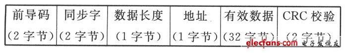 虽然CC1100的传输数率比DMX512的时序速率要高,但毕竟CC1100的FIFO有限,不可能把一个DMX512数据包一次性全部发送出去,因此在主从端之问必须协商一种合适的数据通信格式。CC1100支持4种格式的数据包,分别是:定长(小于255字节)、变长(小于255字节)、无限长和有限长。完整的数据包包括前导码、同步字、数据长度、地址、有效数据和CRC校验。本系统采用有效数据为32字节的有限长格式,具体的数据格式如下: