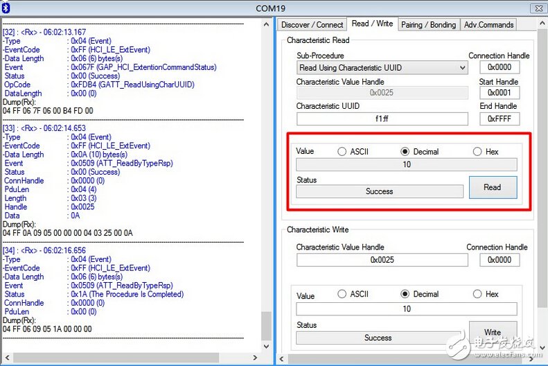 使用UUID读取特征值,CHAR1具有读写属性,这里对 SimpleProfile 的第一特征值 CHAR1进行读取操作,UUID 为0xfff1。选择 Read/Write 选项页并选择 ReadUsing Characteristic UUID 功能,在Characteristic UUID选项填入f1:ff(高字节在前),点击Read按钮。