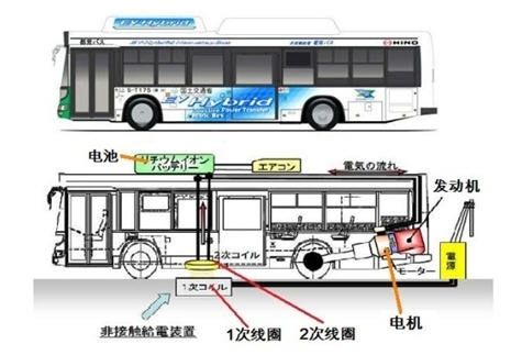 日本无线充电式混合动力巴士:电磁感应式,供电线圈是埋入充电台的混凝土中的。车开上充电台后,当车载线圈对准供电线圈后(重合),车内的仪表板上有一个指示灯会亮,司机按一下充电按钮,就开始充电。