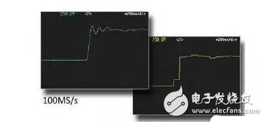 图2:使用DL850 ScopeCorder模块测量的逆变器信号脉冲波形。左侧是采样率为100MS/s的测量结果,右边是使用较早的10MS/s单元测得的结果。