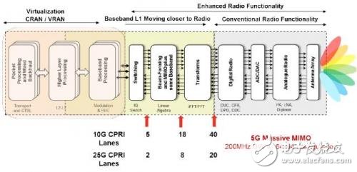 对于 6GHz 以下的部署,5G 系统通常多达 64 个天线单元。6GHz 以上可有更多的天线单元数量。数字波束形成一般用在 6GHz 频率以下的情况(在基带中实现);而结合了数字和模拟波束形成技术的混合方案则用于 6GHz 以上频率。包含 64 个天线单元的 Massive MIMO 系统配置会显著增加复杂性和成本,因为要支持 L1 基带中数字波束形成所需的大量有源无线电信号链和预编码计算。基带处理信号链与远端射频单元之间的连接要求急剧增加。为了比较经济地实现这些系统,有必要在无线电中集成 L1 基带信号处理或其中的一部分。未来的这种功能划分可能导致网络节点中 L1-L2 与无线电功能处在相同位置。图 3 介绍了 64 个天线单元的 Massive MIMO 在不同系统功能边界上的连接要求,凸显了 L1 与无线电共址的必要性。
