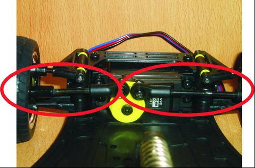前轮是由舵机带动左右横拉杆实现转向的。主销在垂直方向的位置确定后,改变左右横拉杆的长度即可改变前轮前束的大小。左杆短,可调范围为10.8mm~18.1mm;右杆长,可调范围为29.2mm~37.6mm(如图1红圈所示)。