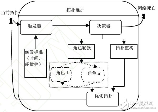 其中触发器主要根据设计的触发标准如时间、能量或节点故障等来触发拓扑维护过程。决策器用来选择拓扑维护策略。