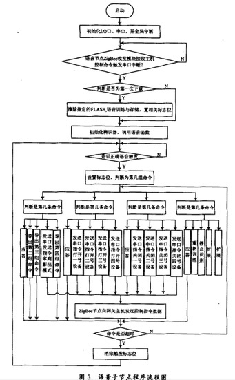 单片机SPCE061A的UART数据格式只有一种,需按照规定的数据格式与CC2530模块进行串口通信。该程序在凌阳科技的μ’nSP IDE集成开发环境下进行开发,并采用凌阳科技提供的语音处理函数以及函数库。语音子节点程序流程图如图3所示。