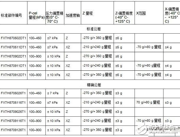 表2. 可订购的TPMS部件,含加速度传感器轴和压力量程