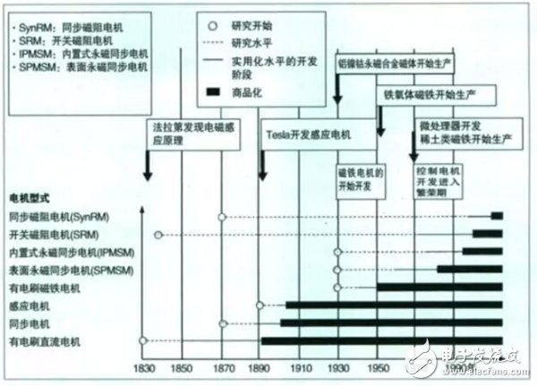 我们先比较各种电机的发展历史,从图4上我们可以看到,有刷直流电机、一般同步电机、感应电机与有刷磁铁电机商品化历史最长,其产品更新换代不断,而且迄今还在应用。而自上世纪80年代开始进入商品化的表面永磁同步电机与1990年代以来研制开发的开关磁阻电机、内置式永磁同步电机以及最新的同步磁阻电机相继进入市场,并在电动汽车与混合动力车上获得应用。