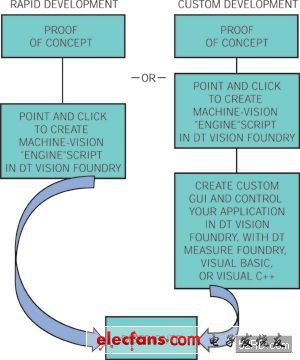 图2 利用Data Translation公司的Vision Foundry进行设备开发的主要替代技术例证了工具箱的优越性,工具箱使你可以利用可配置的基于菜单的交互式工具快速验证概念,然后再通过编程功能改进其设备。在Vision Foundry中,你可以通过编写直观的脚本来完成大部分编程任务。