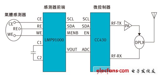 结合LMP91000与德州仪器的CC430等含有类比数位转换器,及大多数无线射频电子装置的超低功耗微控制器,即可形成完整的远端气体侦测平台(见图2)。