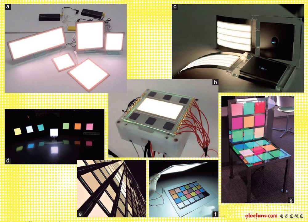 主要的有机EL照明面板如图所示。(a)为Lumiotec面板,(b)为松下的87lm/W面板,(c)为KONICA MINOLTA ADVANCED LAYERS的柔性面板,(d)为住友化学面板,(e)为荷兰皇家飞利浦电子面板,(f)为ASON TECHNOLOGY面板。(g)为用三菱化学的面板制作的椅子。照片除(a)和(g)以外均由各公司提供。