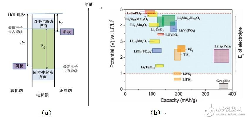 图1 电解液电势窗口与电极活性材料氧化还原势的相对关系。(a)电解液电化学势窗口示意图。(b)常用电极材料电势与有机电解液(1M LiPF6 溶于EC:DEC)的电化学势窗口间的相对关系[2]。