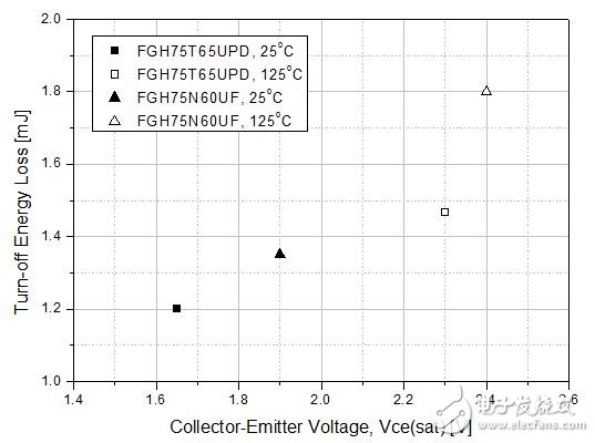 场截止沟道技术利用沟道栅结构和高度掺杂n+缓冲层获得沟道穿通特性。借助这些功能,此新的IGBT技术实现了比上一代技术更高的单元密度。因此,在给定硅面积下它具有低得多的通态压降。新场截止沟道IGBT的电流密度是之前场截止平面技术的两倍以上。图1显示FGH75T65UPD、新的 75A/650V场截止沟道IGBT和FGH75N60UF、75A/600V上一代场截止平面IGBT的权衡特性。FGH75T65UPD在25℃、 75A时实现1.65V的Vce(sat),而FGH75N60UF在相同条件下提供1.9V。考虑到击穿电压增加到650V和活动面积减小,此特性有显著改进,因为较高的阻断电压和较小的尺寸导致Vce(sat)增加。此低Vce(sat)是新场截止沟道IGBT的主要优势。场截止沟道技术还减少了每转换周期的关断能耗,如图1所示。此增强的权衡特性使逆变器设计能够满足较高系统效率的市场需求。尽管硅面积减小,新场截止沟道IGBT在因热失控出现故障之前提供5us短路耐受时间,这是上一代IGBT无法提供的。新场截止沟道IGBT也有较低的关断状态漏电流,最大结温为175℃。